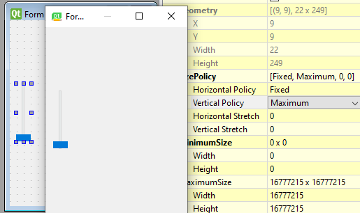 Expanding : Vertical Policy değerini expanding olarak ayarlayalım. Expanded seçeneği preferred seçeneği ile benzerlik gösterir. Farkı anlamak için fom üzerine bir adet daha slider ekleyerek önce her ikisinin de vertical policy özelliğini preferred yapalım.